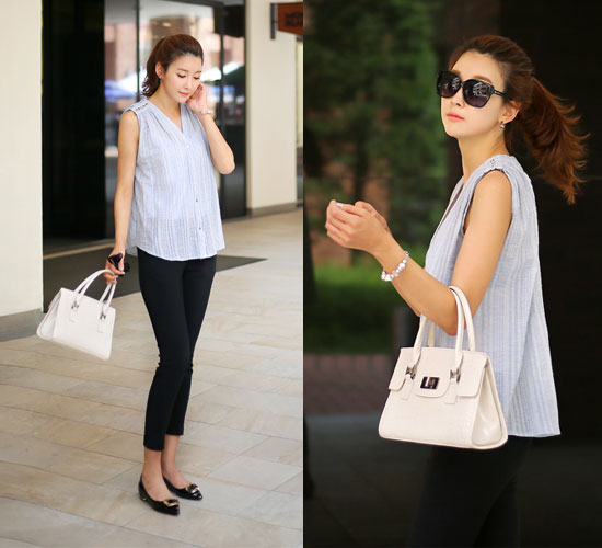 Giản dị và nhã nhặn với túi xách màu trắng sữa kết hợp với áo sơ mi sát nách, quần bo và giày bệt
